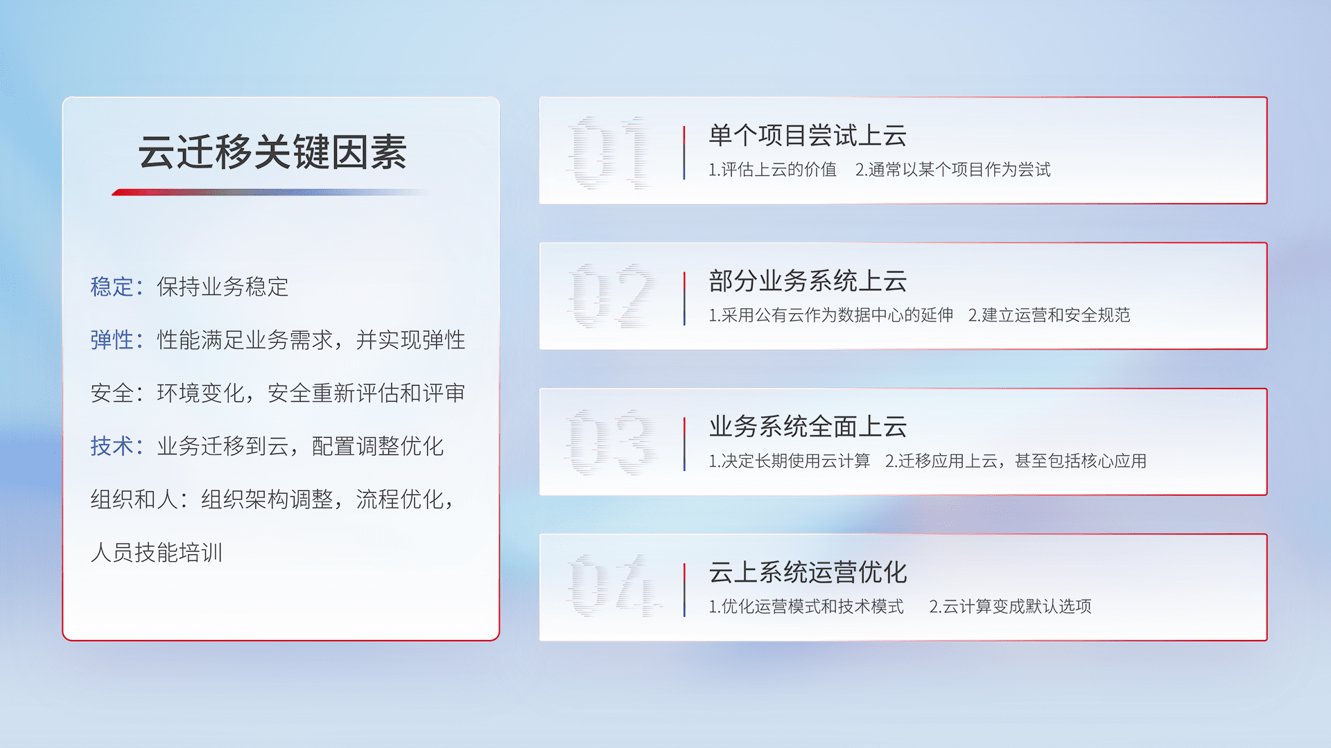 结合实际业务,,,,从规划设计、、云平台选型、、、云原生改造、、、数据迁移、、、集成交付,,,,迁移全过程为客户识别最佳上云路径,,,做好风险识别管理,,,设计网络架构、、、身份权限、、、安全审计合规、、操作审计、、、日志审计、、监控告警策略、、多站点容灾设计等,,对云上基础设施进行整体规划,,,,提升IT治理水平,,以满足弹性、、、高可用、、、高性能的需求。。。。