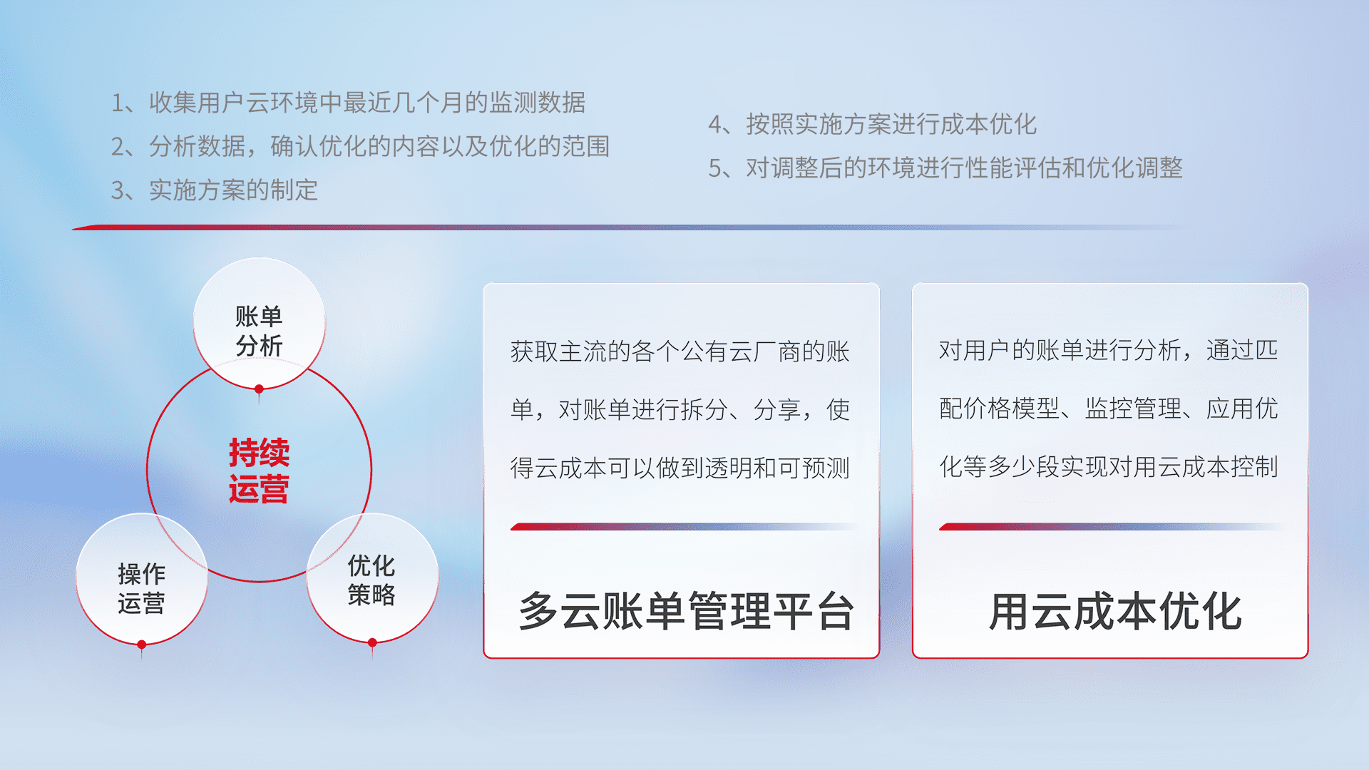 通过多云纳管,,以统一的资源数据模型把客户的云资源进行抽象和封装,,,,进而实现对多云资源的统一操作,,,,保障云资源管理的可靠性、、、、稳定性与可用性。。。量身定制化运维内容,,,,配置、、、开发运维、、、补丁管理、、备份、、、、监控、、认证和访问管理、、审计和日常巡检等,,,,保障在用云过程中的可靠度,,,稳定度以及高可用率。。。